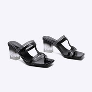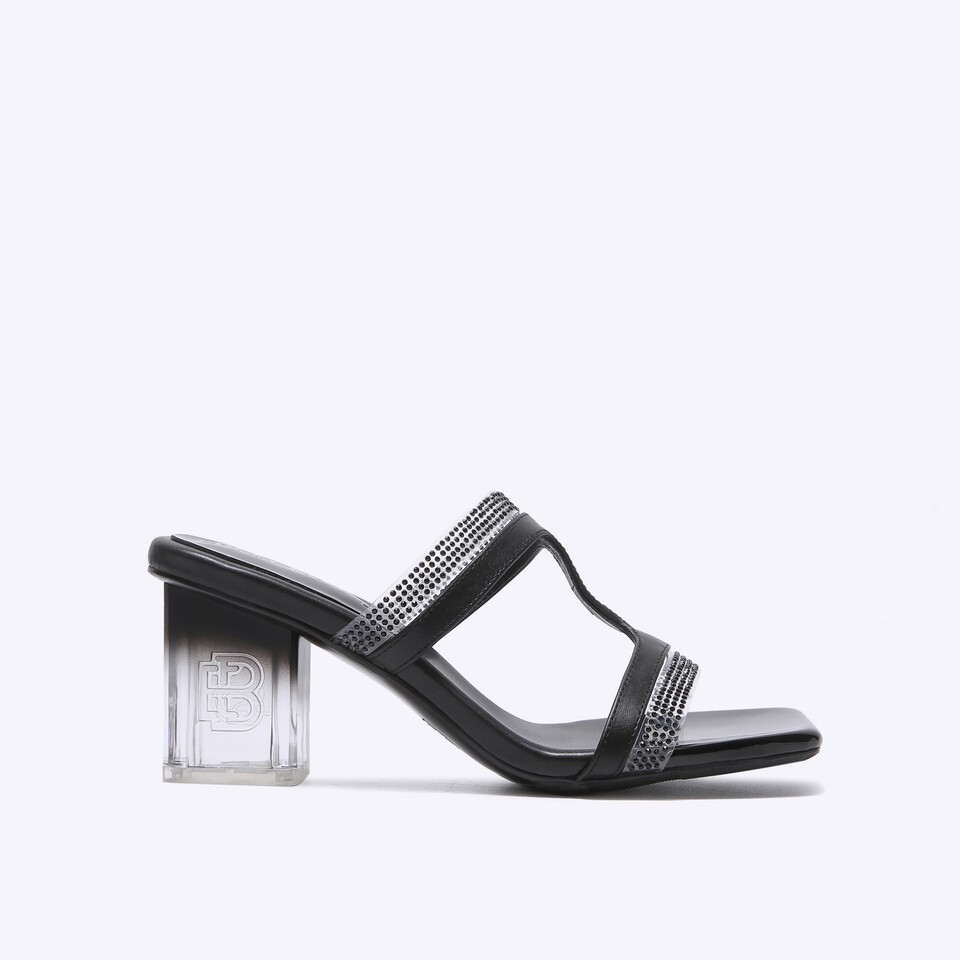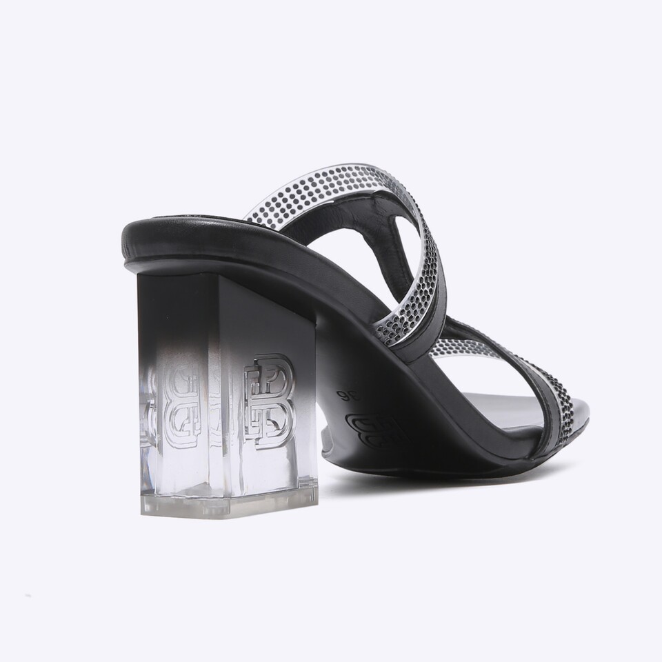 COMETA are the T-strap sandals that feature leather material and crystal transparent straps as the main accents. Set on the glass heels with EB logo on the side and are friendly pair to those who don’t fancy stilettos.
