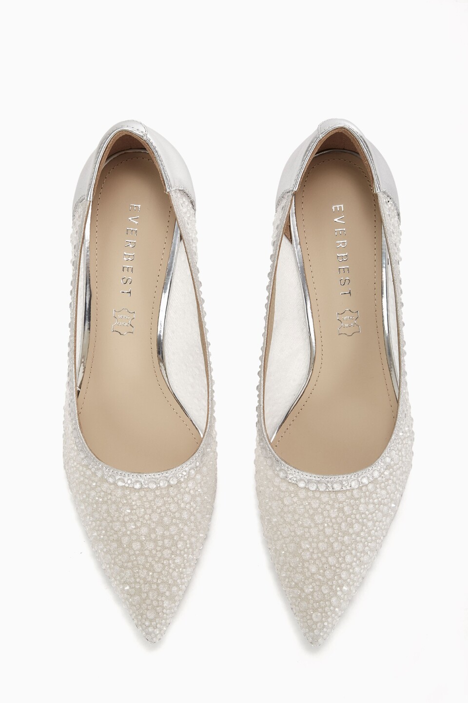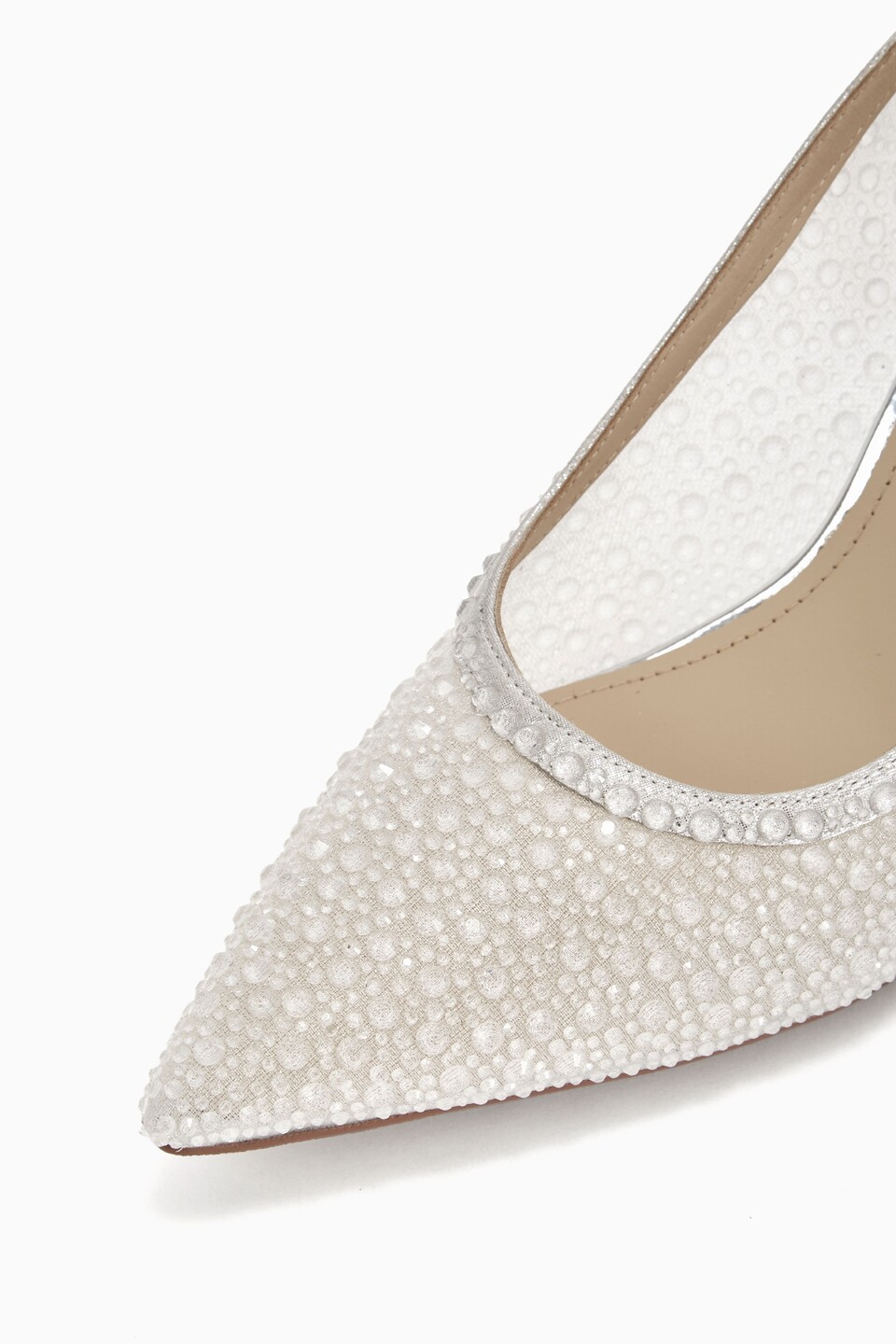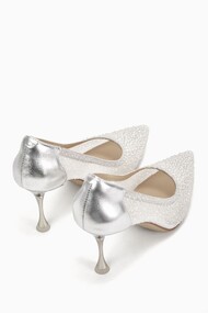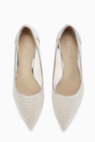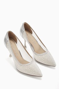 MIVALL, an expression of elegance. Designed in pristine white, these pointed stiletto pumps are accented with a polished silver heel, delicate pearl details, and subtle droplet rhinestones that catch the light with quiet brilliance. Graceful and refined, MIVALL completes your special look with timeless sophistication.