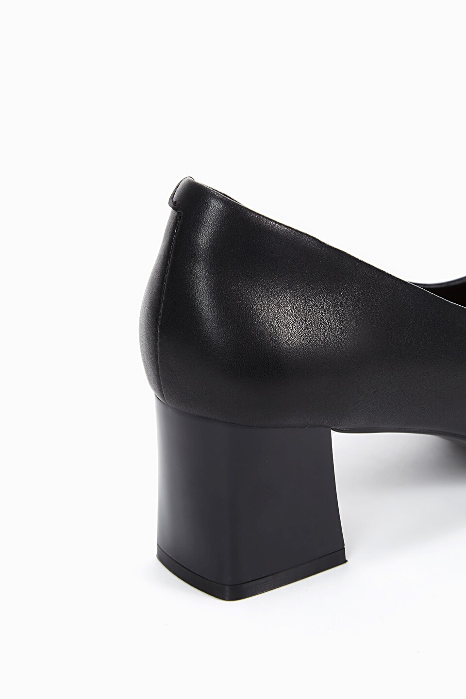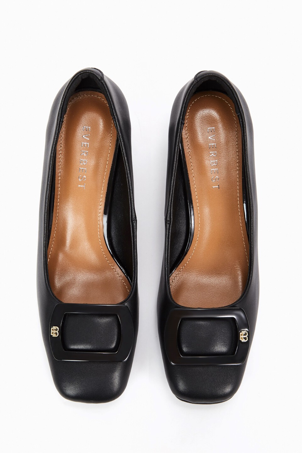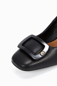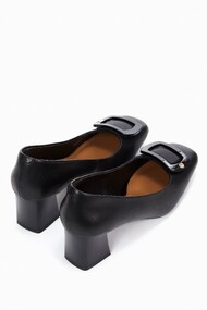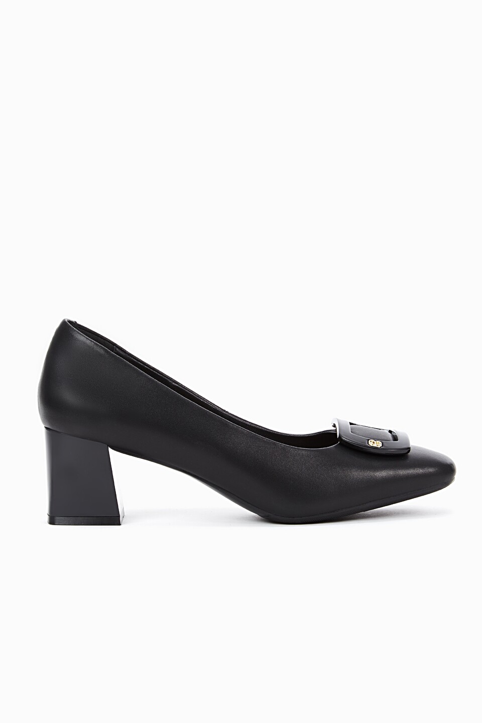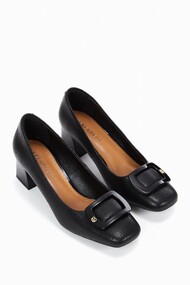 A classic pump style with a squared-toe. The upper portion is a smooth leather in a matte finish. A small, decorative, weaving square shape buckle is situated towards the middle of the toe area of the shoe. The heel is a medium-height block heel with squared base visible make it fashion statment.