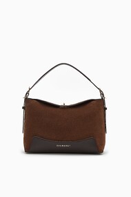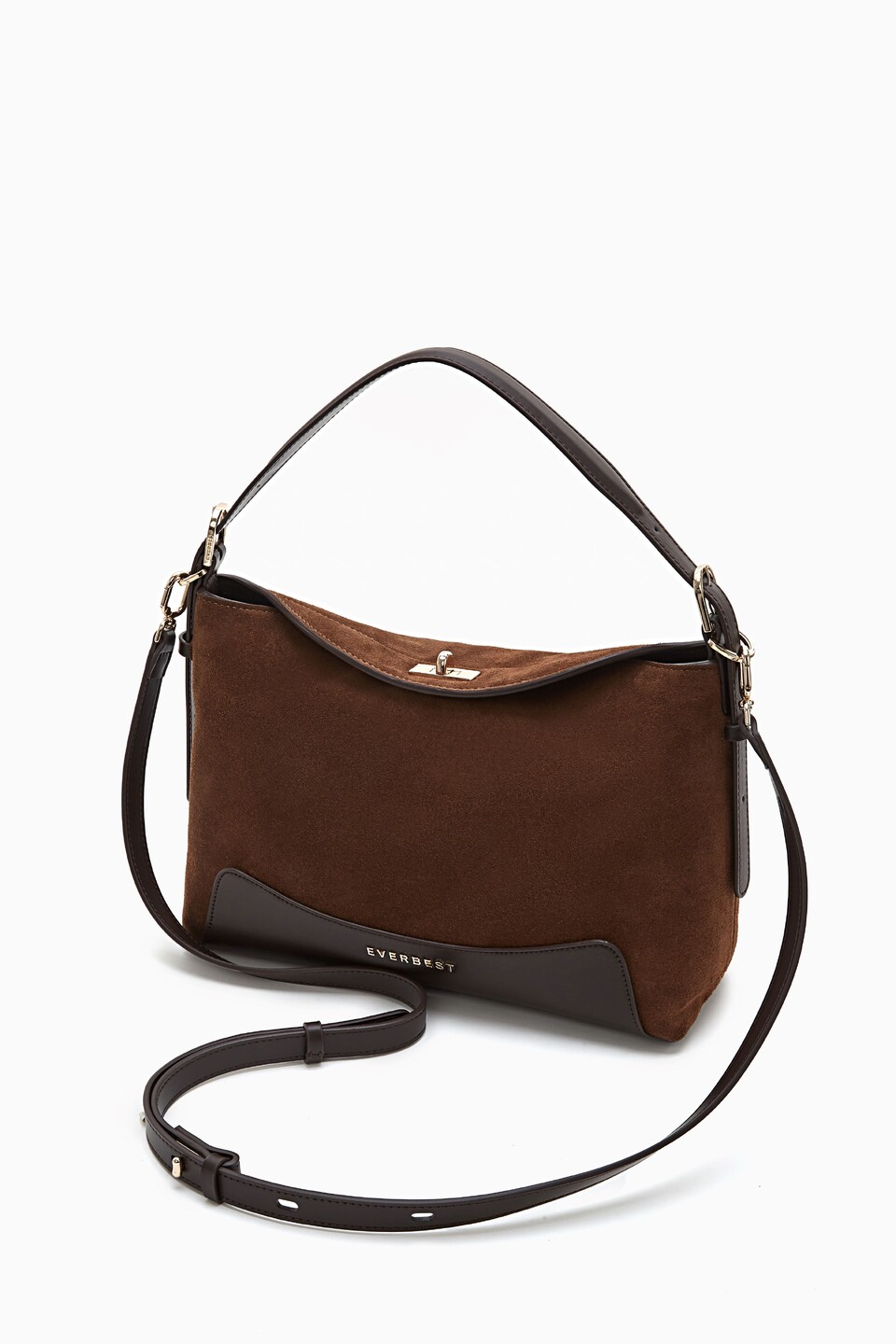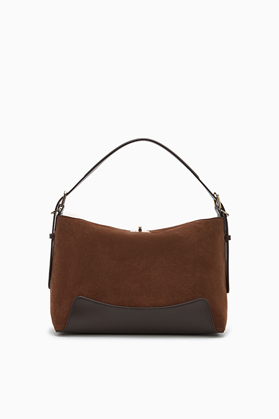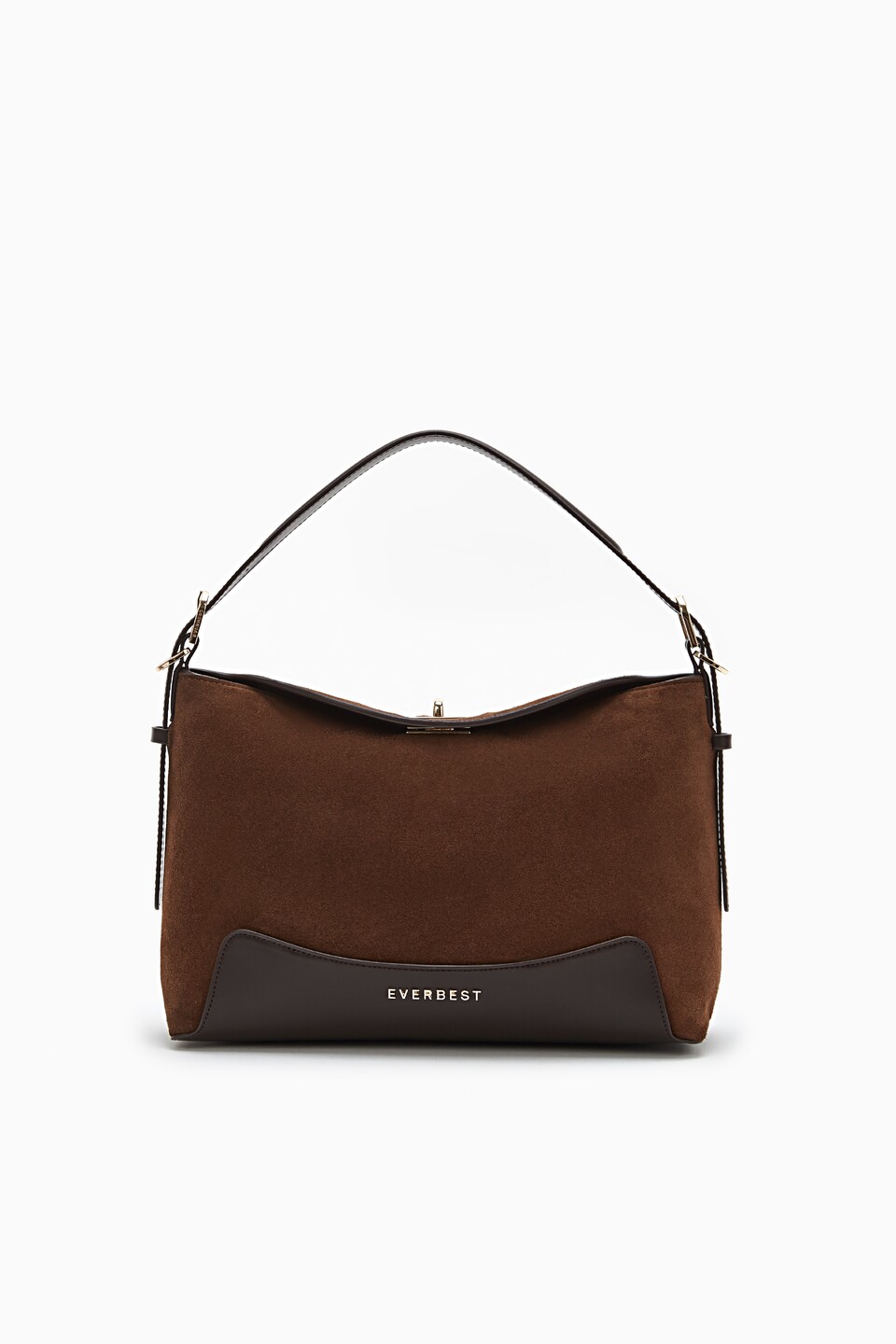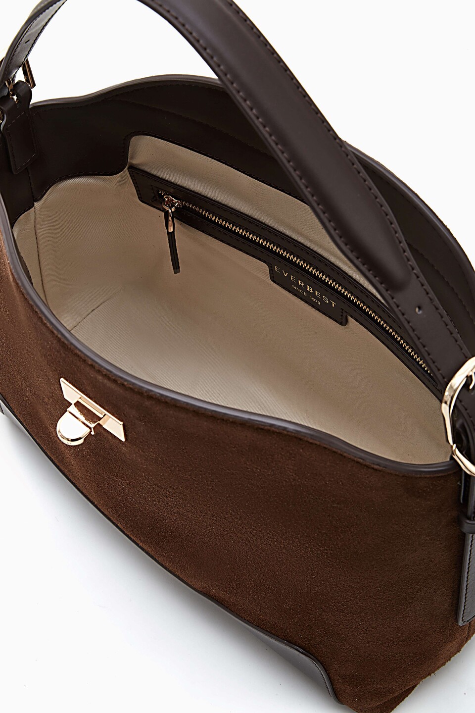 TESA hobo bag combines luxurious suede with smooth leather reinforcement along the base to protect against wear and dirt. Featuring a sophisticated top closure inspired by classic design, an adjustable shoulder strap, and spacious interior, this versatile taupe piece transitions effortlessly from day to night. A timeless essential for the modern woman.